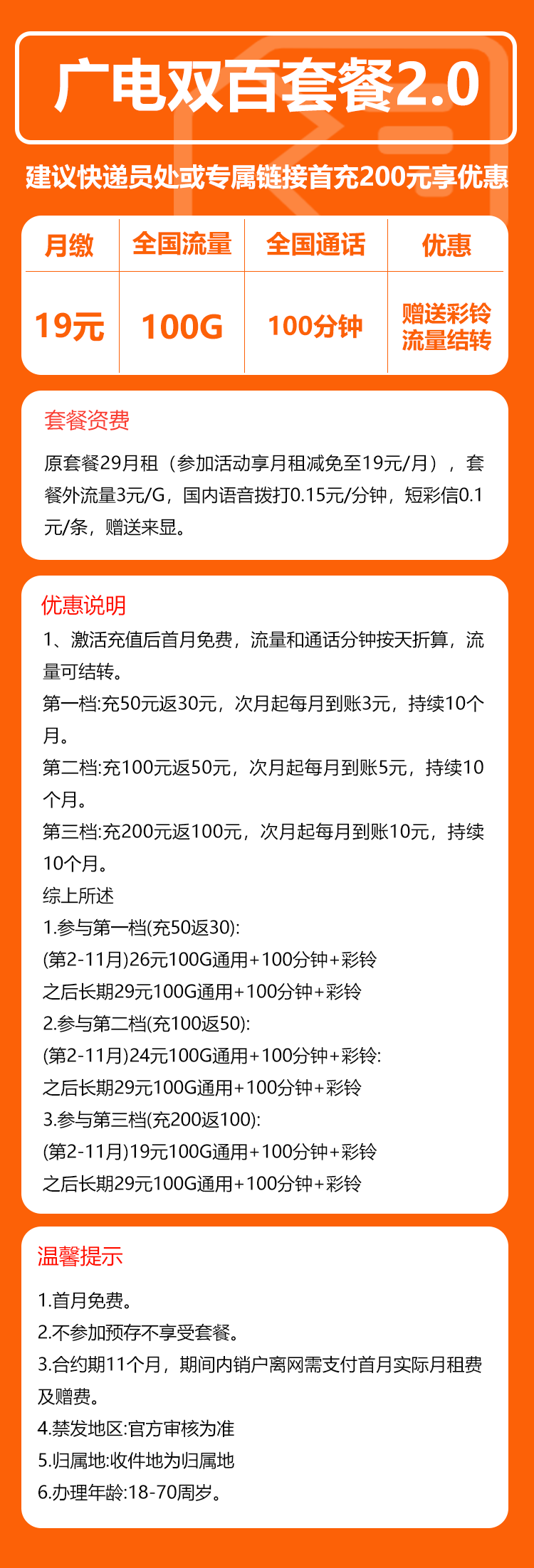 广电双百套餐是一款性价比较高的电话卡套餐,原月租29,首充后19,含100G通用流量,100分钟通话,流量通话长期有效,收货地即卡归属地。以下是其详细信息: