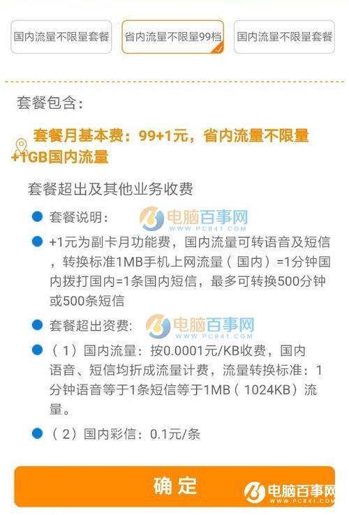 - 99元全国不限量套餐:月租99元,国内流量不限量,当月手机累计上网流量达到20G后,上网速率降至1Mbps。